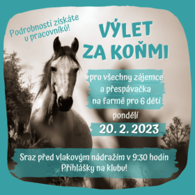 Zveme děti ve věku 8-15 let na celodenní výlet na farmu s koňmi Stáj NaPoli, z. s. Sraz v pondělí 20. února 2023, sraz v 9.30 před vlakovým nádražím Český Brod, předpokládaný návrat v 17.45 opět na zastávce u vlakového nádraží.