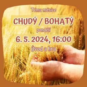 Tématem měsíce května v NZDM Klubu Zvonice Český Brod je CHUDÝ / BOHATÝ. V prvním workshopu si řekneme pár slovem úvodem, vysvětlíme si několik pojmů a zahrajeme si tematickou hru. Akce proběhne v pondělí 6. května 2024 od 16.00 do 18.00 hodin.