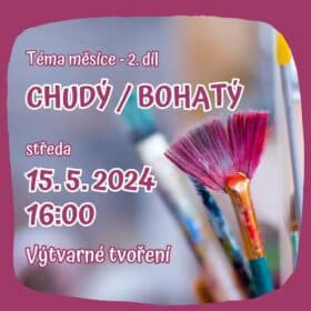 Tématem měsíce května v NZDM Klubu Zvonice Český Brod je CHUDÝ / BOHATÝ. Ve druhém bloku si zopakujeme pár informací a pak si zkusíme výtvarně ztvárnit pojem bohatství.  Workshop proběhne ve středu 15. května 2024 od 16.00 do 18.00 hodin.