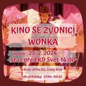 V neděli 25. 2. 2024 před jarními prázdninami vyrazíme s NZDM Klubem Zvonice Český Brod do místního kina v KD Svět na film Wonka. Sraz ve 14:00 hodin. Cena: 100 Kč. Přihlášky k vyzvednutí v klubu! (Výlet se koná za podmínky přihlášených alespoň 6 dětí.)