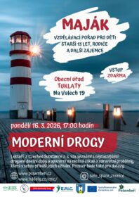 Zveme děti a mládež starší 13 let, rodiče i širokou veřejnost na vzdělávací pořad MAJÁK, který se zaměří na téma moderních drog a jejich vliv na zdraví i každodenní život mladých lidí. Setkání se uskuteční v pondělí 16. března 2026 od 17:00 hodin v prostorách Obecního úřadu Tuklaty, Na Valech 19. Vstup na akci je zdarma.