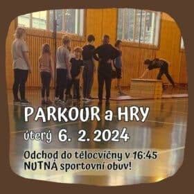 V úterý 6. 2. 2024 vyrazíme s dětmi do tělocvičny Základní školy a Praktické školy. Žitomířská 1359, Český Brod. Pod vedením lektorů z agentury Hejbeme se! si vyzkoušíme základy parkouru a několik sportovních soutěží. Z klubu odcházíme v 16:45 hodin. Nutností je vhodná sportovní obuv. Akce je bez přihlášek.