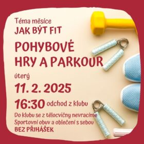 Zveme vás do NZDM Klub Zvonice v Českém Brodě na pohybové hry a parkour, které se budou konat v úterý 11. února 2025 od 16.30 hodin. Sraz je v NZDM Klub Zvonice, odkud se společně přesuneme do tělocvičny. Návrat do klubu není plánován. Nezapomeňte si vzít sportovní obuv a oblečení. Aktivita je druhým dílem tématu měsíce Jak být fit.