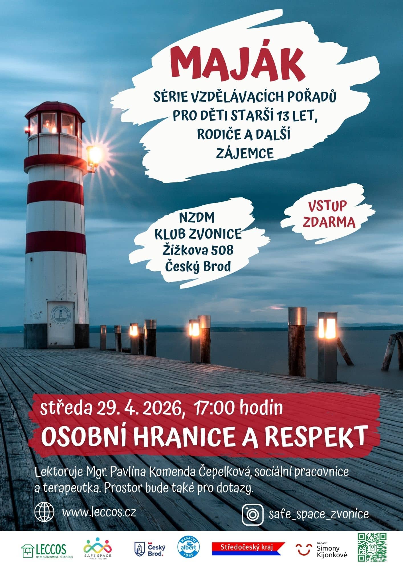 Zveme děti starší 13 let, rodiče i další zájemce na další setkání ze série vzdělávacích pořadů MAJÁK, které se tentokrát zaměří na téma osobních hranic a respektu. Společně se budeme věnovat tomu, jak poznat vlastní…