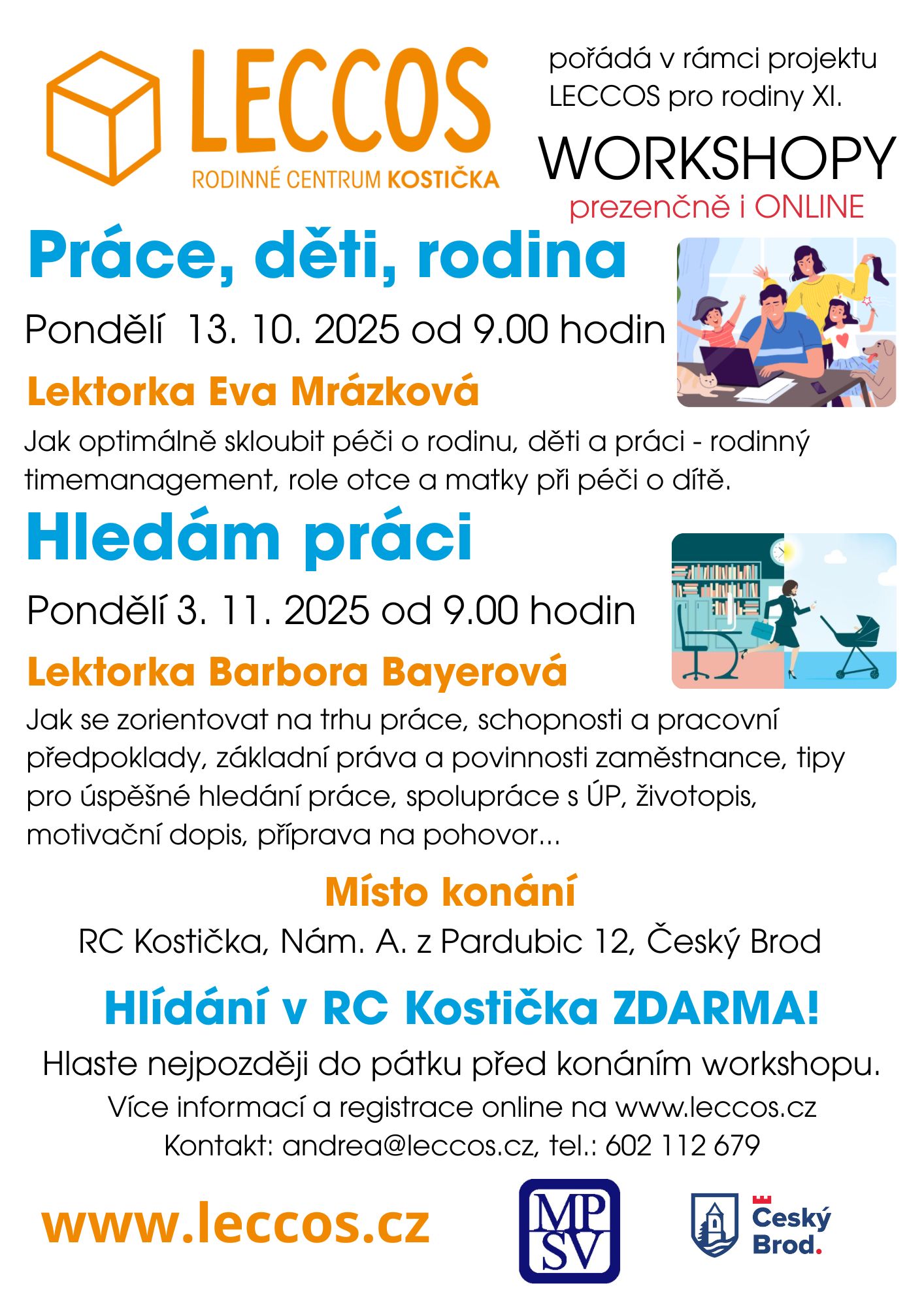 Jak optimálně skloubit péči o rodinu, děti a práci. Rodinný timemanagement. Role otce a matky při péči o dítě. Lektorka Eva Mrázková Místo konání RC Kostička – Náměstí Arnošta z Pardubic 12, Český Brod HLÍDÁNÍ DĚTÍ…