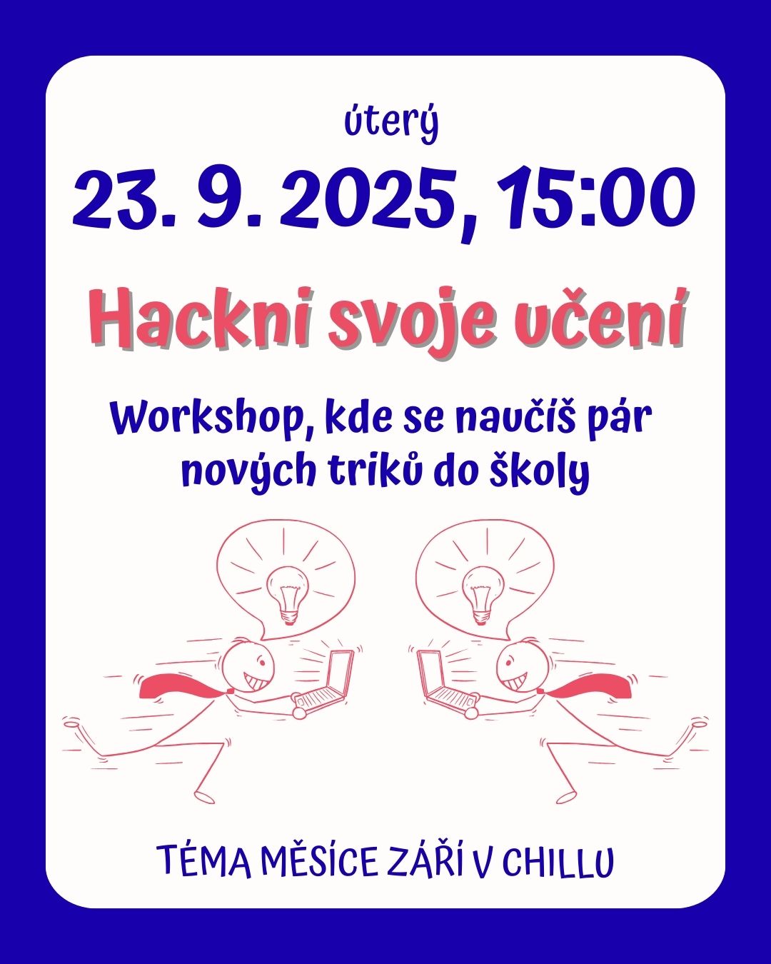 V úterý 23. září 2025 od 15.00 se v NZDM Klubu Zvonice Český Brod koná workshop Hackni svoje učení. Naučíme vás pár triků, jak si usnadnit školu a zlepšit své studijní návyky. Akce je zdarma…
