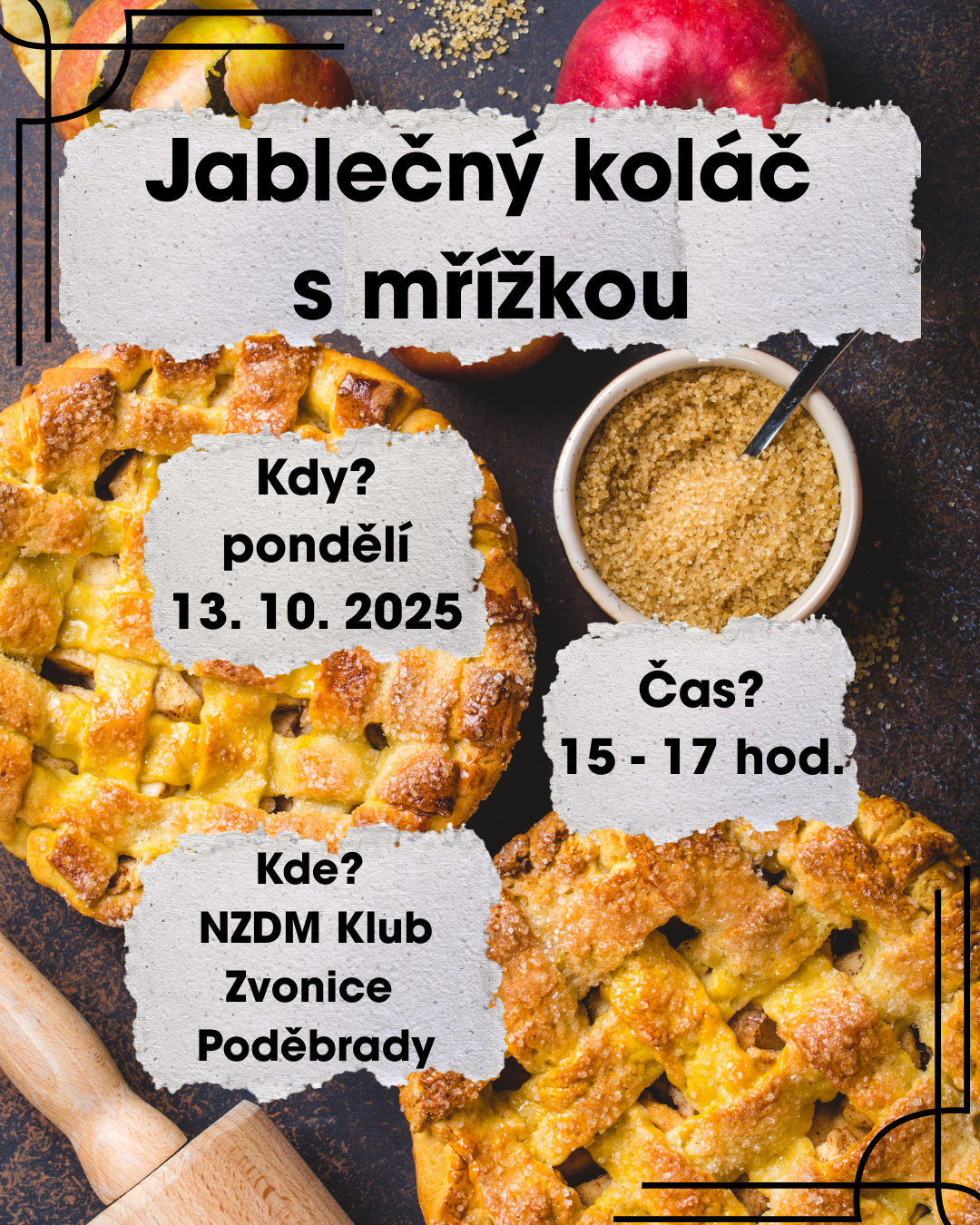 V říjnu si na klubu upečeme výborný jablečný koláč. Doraž na klub v pondělí 13. 10. 2025! Začínáme v 15 hod. Těšíme se na tebe!