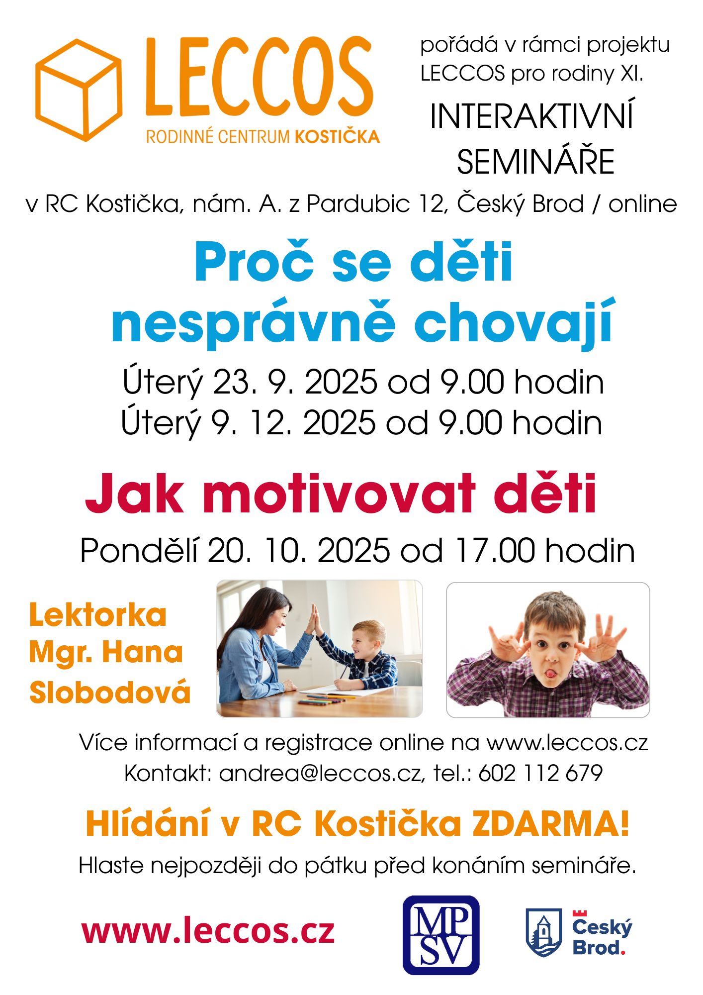 Interaktivní seminář se zkušenou psycholožkou Lektorka Mgr. Hana Slobodová jsou vaše děti bez zájmu a nevíte jak je motivovat jak zvládat různé nálady dětí jak naučit děti samostatnosti a zodpovědnosti zpětná vazba jako účinný nástroj…