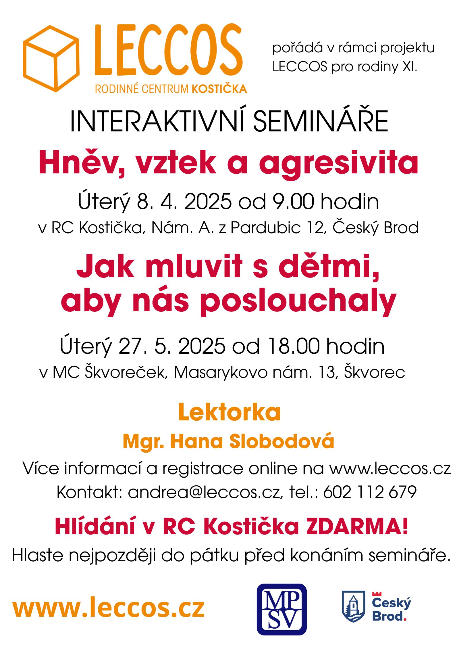 Interaktivní seminář se zkušenou psycholožkou v rámci programu Setkání pro rodiny s dětmi. Lektorka Mgr. Hana Slobodová ujasnění základních pojmů versus individuální pojetí, terminologie, fyziologie prožívání člověka zdravě a patologicky vyjádřený hněv, co ho spouští…