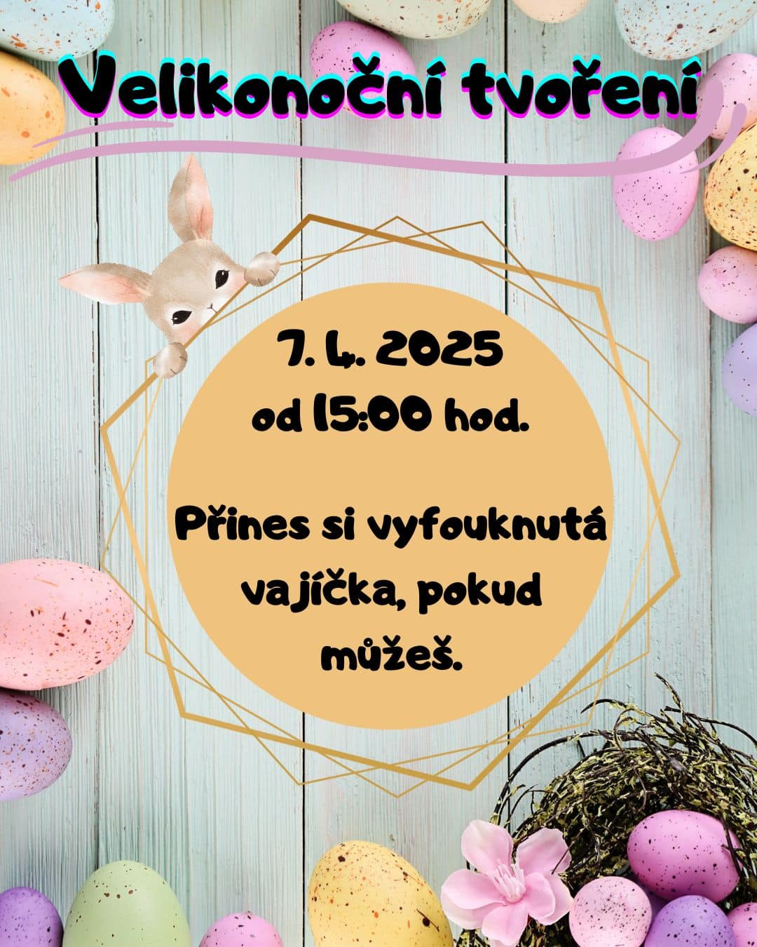 V pondělí 7. 4. 2025 proběhne na klubu velikonoční tvoření. Začínáme v 15:00! Přineste si vyfouknutá vajíčka, pokud můžete.