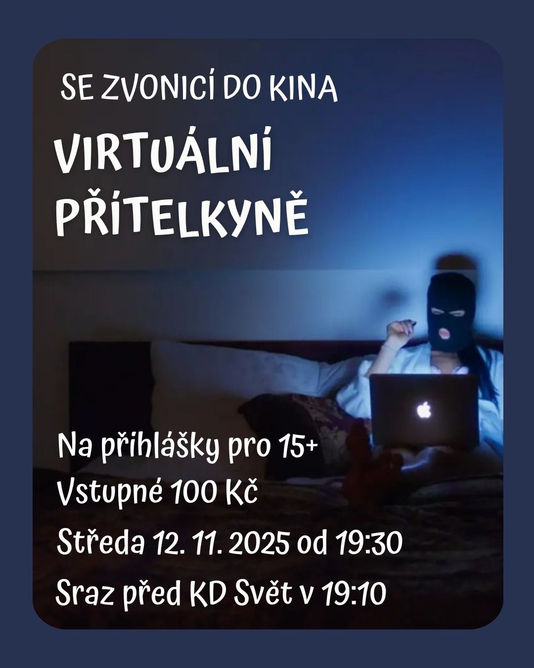 Ve středu 12. listopadu 2025 od 19.30 se vydáme společně do kina na film Virtuální přítelkyně. Sraz je v 19.10 před KD Svět v Českém Brodě. Akce je určena pro přihlášené účastníky od 15 let.…