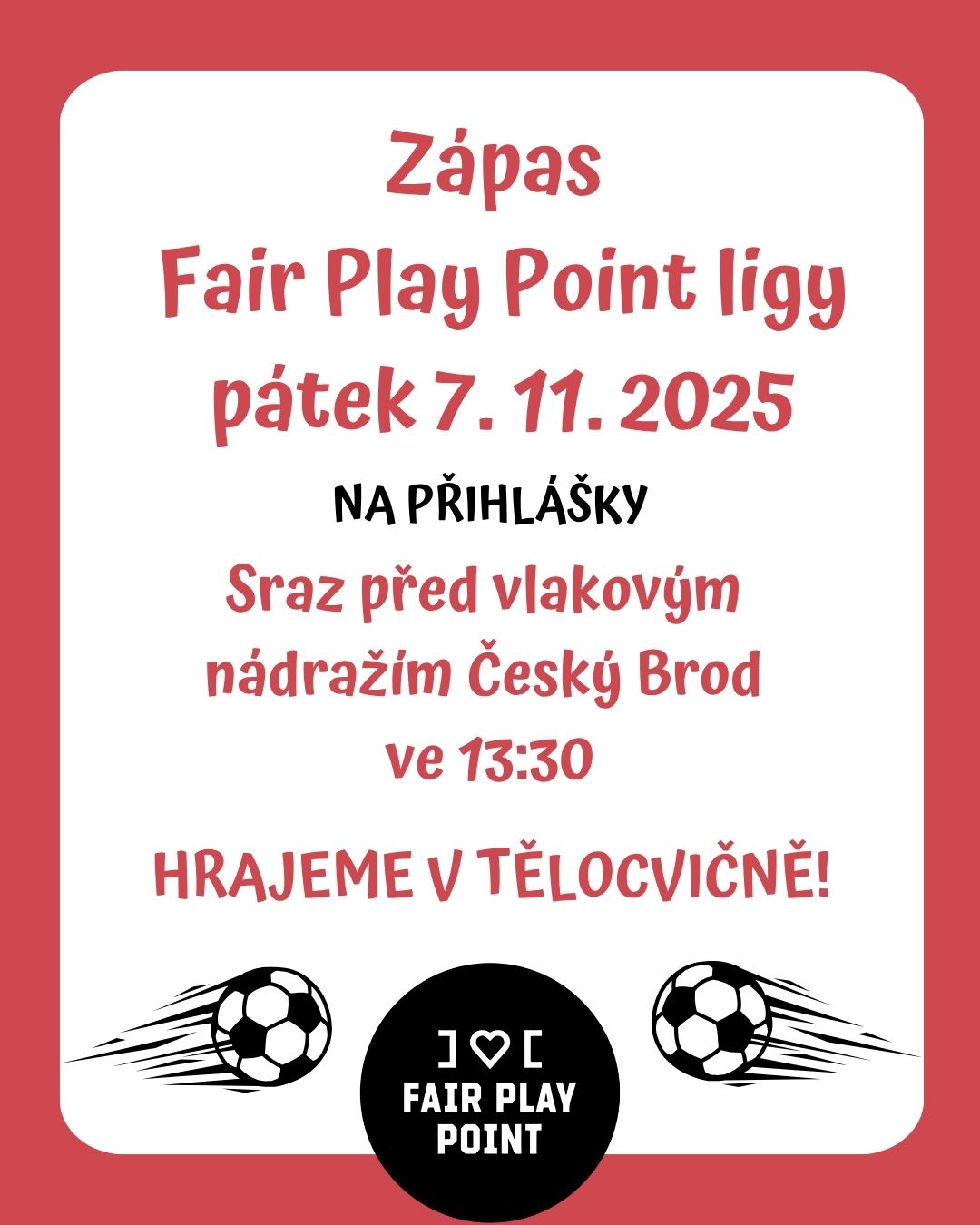 V pátek 7. listopadu 2025 se uskuteční zápas Fair Play Point ligy. Sraz je ve 13.30 před vlakovým nádražím v Českém Brodě, odkud se společně přesuneme do tělocvičny v Praze. (Střední průmyslová škola stavební Josefa…