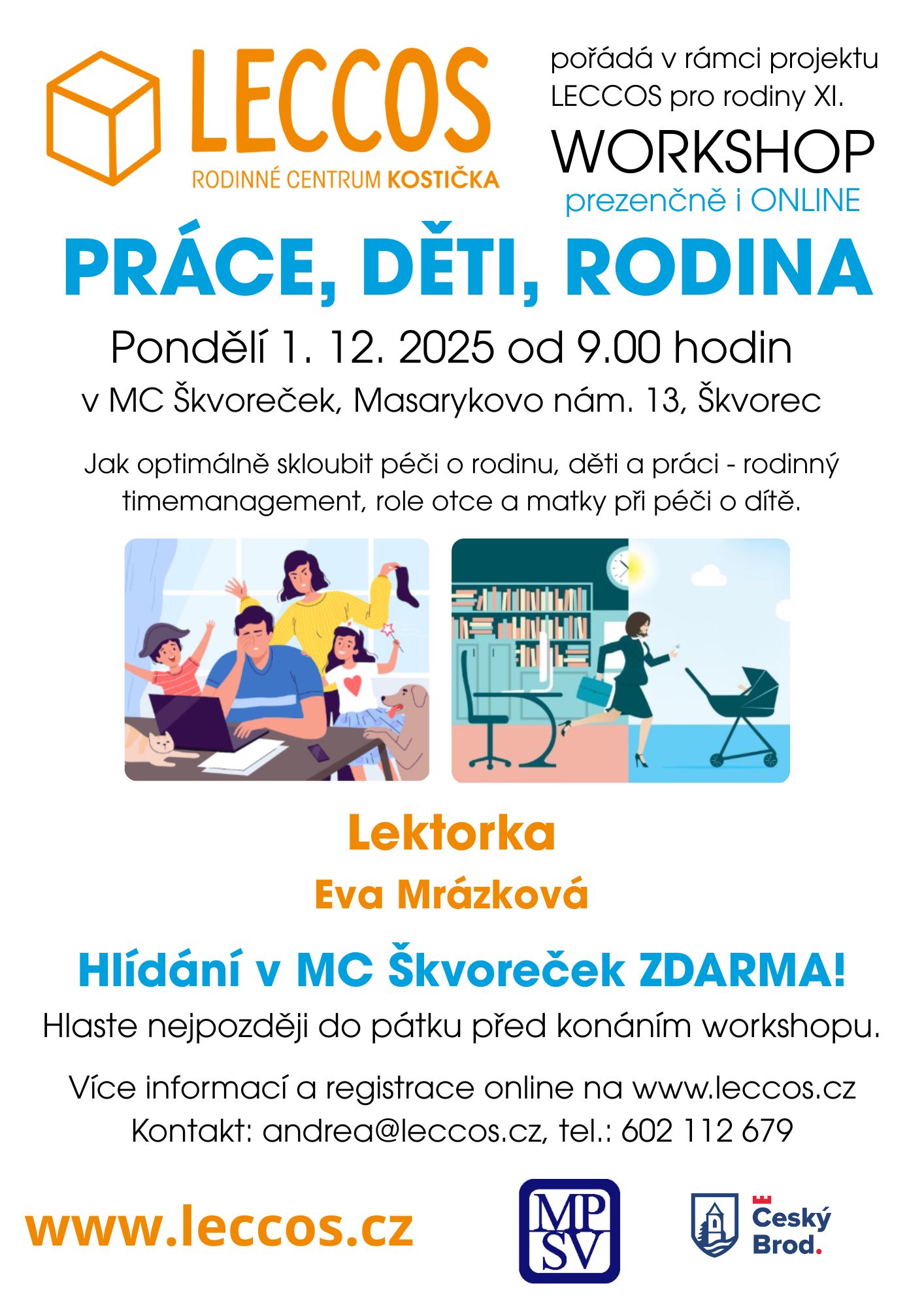Jak optimálně skloubit péči o rodinu, děti a práci. Rodinný timemanagement. Role otce a matky při péči o dítě. Lektorka Eva Mrázková Místo konání MC Škvoreček ve Škvorci HLÍDÁNÍ DĚTÍ ZDARMA v MC Škvoreček! Registrujte…