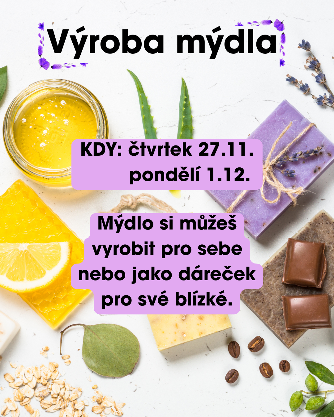 Ve čtvrtek 27. 11. a v pondělí 1. 12. 2025 budeme společně vyrábět mýdla. Přidej se k nám!