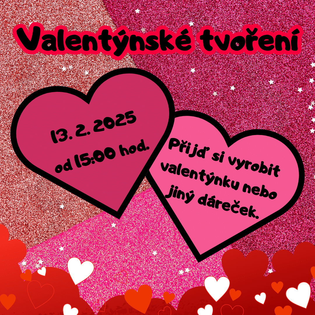 Ve čtvrtek 13.2.2025 proběhne na klubu Valentýnské tvoření. Děti si budou moci vyrobit valentýnku nebo jiný dáreček. Začínáme v 15:00!