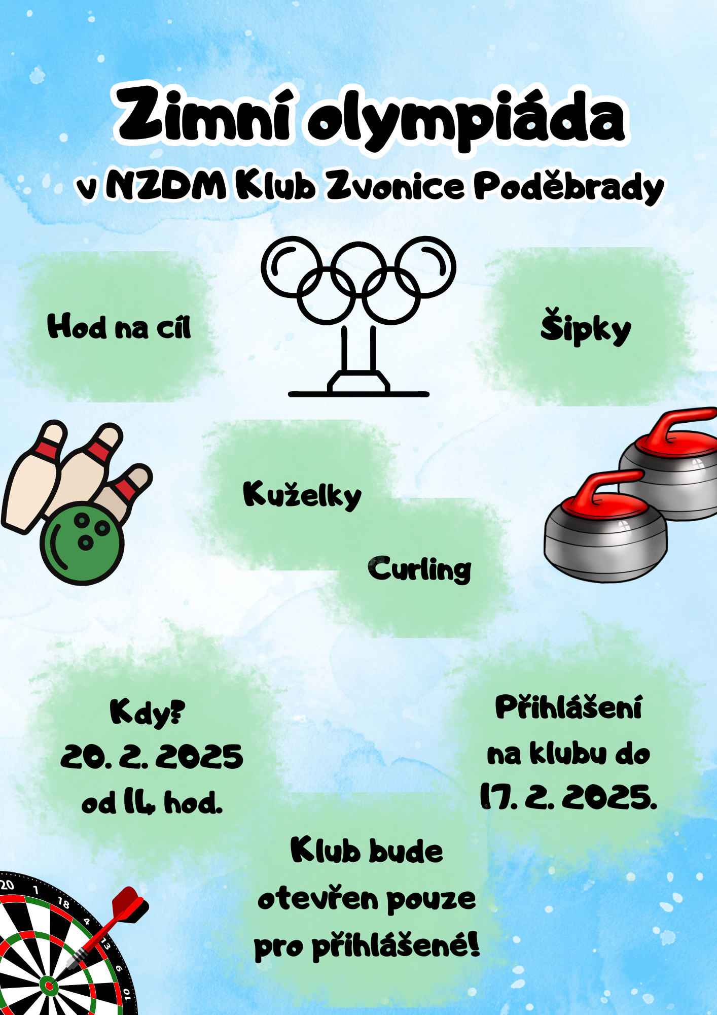 Baví tě šipky, curling, kuželky nebo hod na cíl? Tak se přihlaš na klubovou Zimní olympiádu. Přijď si zasoutěžit a změřit síly s ostatními! Akce se koná ve čtvrtek 20. 2. 2025 a začínáme ve 14 hod.  Na akci je…
