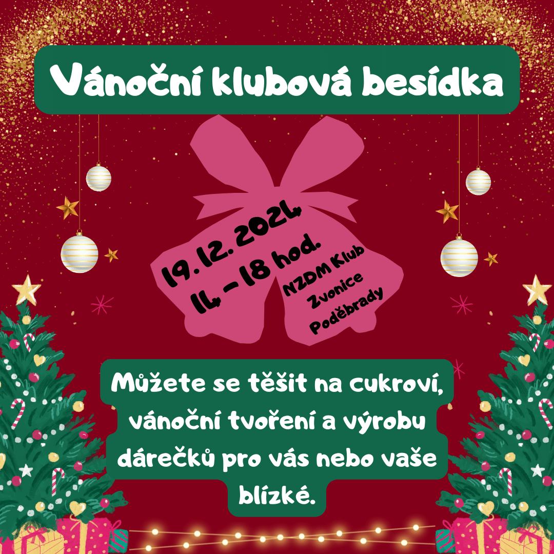 Tradiční Vánoční klubová besídka proběhne 19. 12. 2024! Děti se mohou těšit na cukroví, vánoční tvoření a výrobu dárečků. Samozřejmě nebude chybět vánoční pohodová nálada. Začínáme ve 14:00 hod.
