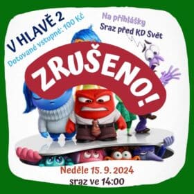 V neděli 15. září 2024 vyrazíme s našimi uživateli NZDM do místního KD Svět. Promítat se bude film V hlavě 2. Sraz před kinem ve 14.00 hodin na adrese Kulturní dům Svět, Krále Jiřího 332, Český Brod.
