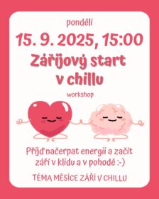 V pondělí 15. září 2025 od 15.00 zveme všechny zájemce do NZDM Klubu Zvonice Český Brod na Zářijový start v chillu. Přijďte načerpat energii, odpočinout si a začít září v klidu a pohodě.